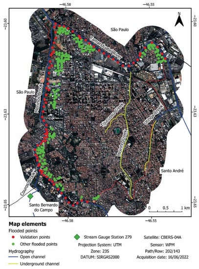 CBERS-04A satellite image of São Caetano do Sul and its municipal limits (red line) surrounded by a 500 m buffer, indicating flooded points reported by the civil defense of São Caetano do Sul and its citizens on 10 March 2019 (a 79-year return period event). Red points are used for validation since they are reported with estimated water depth.