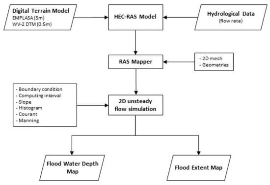 Aiming to obtain the best simulation results as possible, four computing intervals were performed as follows: 1 s, 15 s, 30 s, and 60 s. Three different mesh sizes were set for the model execution: (i) 5 m for the entire study area with the EMPLASA DTM; (ii) 5 m for the entire study area with the finer DTM; and (iii) 5 m in the dry areas and 1 m in the stream channels (using the refinement tool) with the finer DTM. This difference in the mesh size configuration with the finer DTM was applied in order to analyze the impacts of the mesh refinement in the mapping of the flood-prone areas. All other HEC-RAS parameters were kept the same for the simulations. A summary of the methodology is shown in Figure 5. A total of 12 flood maps were generated (4 different computing intervals for each mesh size setup) [].