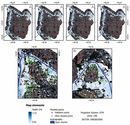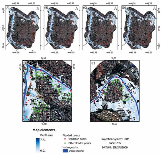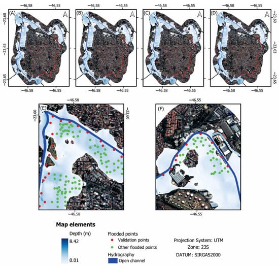 Flood maps generated in HEC-RAS. (A–D) represent the simulations with the computing interval of 1, 15, 30, and 60 s, respectively, with the finer DTM (0.50 m). (E) is a zoom-in of the confluence of Tamanduateí River and Meninos Brook in the northwestern region of the study area. (F) shows a zoom-in of the Tamanduateí River in the northeastern part of the analyzed reach. Red points are used for validation, while the green points represent other flooded points reported by the citizens of São Caetano do Sul. The thick lines in dark blue correspond to the open channels. The different shades of blue in polygonal shape account for the different depths of the flood zones.