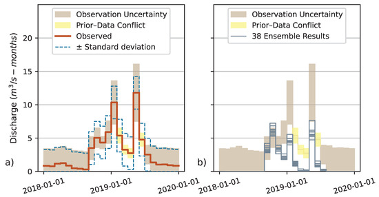Figure 7 shows that “Observation Uncertainty” envelopes, which are the expected uncertainty envelope observation error model, generally have a smaller range than “±Standard deviation” envelopes, which are the standard deviation observation error model, suggesting that the expected uncertainty envelope will produce relatively narrow posterior distributions, denoting a decrease in parameter variance and amelioration of the variance portion of the bias–variance trade-off.