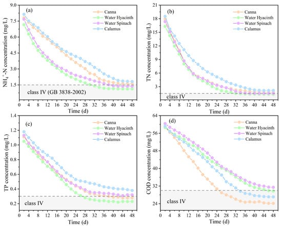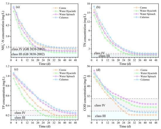 Therefore, it can be observed in Figure 1 that different plants displayed quite diverse performances in NH4+-N, TN, TP, and COD removal, which may be owing to the capacity discrepancy of root filtration, plant growth, oxygen production, etc. Furthermore, it can be seen that removal efficiencies were quite remarkable in the first few days (e.g., 0~8 d) while the decreasing of contaminants was so negligible during the final stage (e.g., 40~48 d), since the immobilization and utilization effects of roots for plant growth as well as the metabolism of microbes could be proceeded quickly; thus, the macroscopic phenomena showed the significant decreasing of various contaminants at first. However, the immobilization capacity would be saturated, and the rate of growth or metabolism would be flat or even stagnant during the process. Consequently, variation of the general removal efficiency would be more and more gradual, and it could be seen that the removal obtained the equilibrium in the last few days. Moreover, it can be seen that indexes of treated water can meet or nearly accord with the class IV of the quality standards for surface water (GB 3838-2002), showing that the four plants used in the floating islands showed great potential for the removal of contaminants. In general, water hyacinth displayed a relatively superlative performance among them since all the indexes of the related plant island met the standard of class IV.