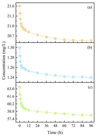 Based on the result above, biochar was utilized as fillers for strengthening the capacity of floating islands and increasing the removal efficiencies on the whole. As shown in Figure 2, all the composite islands displayed better performance and various indexes of treated water met class IV of the standard (GB 3838-2002), and some of them could even accorded with class III, demonstrating the significant effectiveness for water purification with the additional fillers. Furthermore, it can be found that the fast removal process was remarkably enhanced, especially at the first stage of 0~8 d, and the final equilibrium reached in advance, which could be attributed to the brilliant properties of biochar. Briefly, biochar displayed brilliant performance in the porous structure and functional groups, which provided abundant active sites for the rapid adsorption process, and the generally negative charged properties were also conducive to the removal of contaminants such as NH4+-N [,,]. In order to eliminate the effects of biochar on the removal efficiencies, exploration for the removal of various contaminants with biochar alone was conducted; the results are shown in Figure 3. It can be observed that the rapid adsorption proceeded within the first 2 h, since active sites on biochar were relatively abundant and the contaminants could be adsorbed quickly. However, the adsorption was quite ponderous as the reaction proceeded, and it reached equilibrium in the later dozens of hours, yet the overall removal efficiencies were not very significant, showing that the enhancement above did not originate from the direct adsorption by biochar. Accordingly, water purification in composite island systems can be actually reckoned on the synergism among plants, biochar, and the attached microbes. Apart from the effects analyzed in Section 3.1.1, biochar participated in the direct and indirect pathways during the removal process, and Scheme 1 exhibits the figurative effects. Firstly, pores and functional groups always served as active sites for the physical and chemical removal, such as pore filling and surface complexation, and the effects were especially notable during the initially rapid adsorption process [,,]. Additionally, concentrations of N and P around the roots would be higher owing to the enrichment of biochar, thus realizing the better utilization by plants and further boosting the removal of contaminants by plants and the attached microbes. In addition, biofilms can be gradually formed on biochar particles and the extra biological metabolism would further promote the removal of NH4+-N, P, COD, etc. In general, adding biochar could not only stimulate the initial adsorption with obvious effects but also continuously affect the subsequent process. Hence, the performance, including the rate of rapid adsorption, the final efficiencies, and the equilibrium during the whole running, was much better than plant islands.