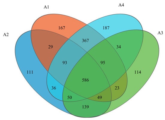As shown in Table 2, it can be observed that A1 and A4 exhibited the higher indices of Shannon, Ace, and Chao, indicating that plant islands of canna and calamus showed better microbial richness; meanwhile, ecosystems of them may be more tolerant to pollutants and more conducive to microbial activity. Consequently, it can be explained why canna and calamus islands displayed the better performance of organics removal in Section 3.1.1. Furthermore, Venn diagram analysis was performed on the samples, and the results are shown in Figure 4. The number of OTUs shared among all the islands reached 586, implying that the community structures of the plant islands above were quite similar. Notably, unique microbes of A1 (167) and A4 (187) were much higher than A2 and A3, which may be another reason why they possessed the higher removal efficiency of organics.