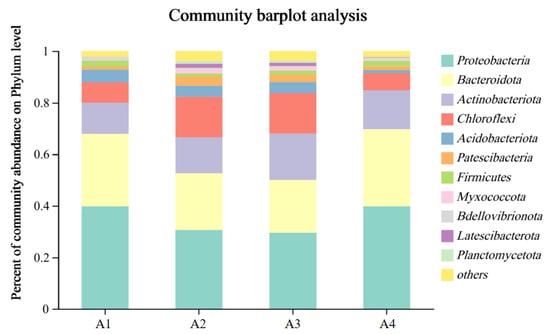 For more specific comparison, the evolution of microbial community structure at phylum or genus level was proceeded for further exploration. As shown in Figure 5, it can be observed that Proteobacteria [], Bacteroidota [], Actinobacterio [], Chloroflexi [], and Acidobacteriota [] were the dominant phylum in the plant islands, and it was interesting that all of them were capable of removing nitrogen and organics, which accounted for a proportion over 87.48% in the islands above. The phenomena above could be explained by the comprehensive results of the strong survival ability of microorganisms and the excellent living conditions provided by plant islands. Consequently, it seemed that the resistance to the growth and reproduction for functional bacteria was quite negligible; thus, the removal of nitrogen and organics could be conducted with great efficiency. Moreover, it can be found that Proteobacteria (A1: 39.75%; A2: 30.55%; A3: 29.50%; A4: 39.74%) and Bacteroidota (A1: 28.18%; A2: 22.04%; A3: 20.50%; A4: 29.92%) were much more significant in canna and calamus islands, while water hyacinth and water spinach depended more on the other advantageous gates, which may explain why water hyacinth and water spinach displayed a better performance in NH4+-N removal. In summary, functions of dominant flora tended to be the same, although there were some differences in the abundance of dominant phylum in the plant islands above, and the microorganisms with higher abundance played the key roles in the better performance in the removal.