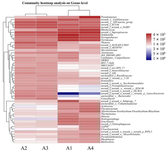 However, results concerning both water purification in Section 3.1.1 and microbial community determination in Figure 6 showed that A2 and A3 were more effective for nitrogen removal. It could be observed that the typical denitrifying bacteria, such as Dokdonella, Caldilineaceae, and Thauera, occupied the higher abundance in A2 and A3, indicating that conditions of A2 and A3 were more suitable for the survival of denitrification bacteria and more conducive to the process of nitrogen removal [,,]. Furthermore, SC-I-84 showed strong tolerance to highly polluting environments; thus, the notable abundance indicated that the composition of plant islands and biochar fillers were conducive to the survival of microorganisms []. Furthermore, it has been revealed that NS9_marine_group displayed the brilliant function of nitrification, and the significant abundance in A2 and A3 verified the advantages of NH4+-N removal efficiency in Section 3.1.1 []. In conclusion, differences among the removal of various contaminants, such as nitrogen and organics, were more likely to depend on the interactions among the key functional microorganisms, and the suitable conditions provided by plant islands played pivotal roles in the distribution of dominant bacteria.
