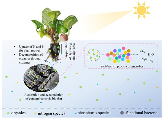 (1) The well-grown roots exhibited a great network structure and acted as the filter to realize the preliminary immobilization of contaminants; (2) N and P could act as the essential components for the growth of plants, and the attached microbes could also realize the transformation through metabolism, such as NH4+-N, NO3−-N, P, etc., thus finally decreasing the concentration of N and P moieties in the aqueous environment; (3) organics could be decomposed with the effects of enzymes produced by roots; meanwhile, microbes could take advantages of organics as the carbon source for the growth, thus facilitating the degradation during the metabolism process; (4) oxygen could be secreted by roots to form the anaerobic/anoxic/aerobic micro-areas, which provided the microbes with suitable conditions for the removal of N and P [,,,,].