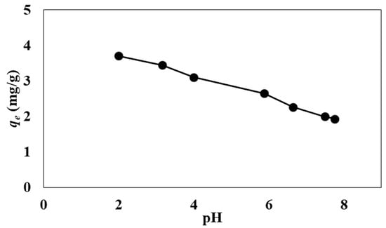 Effect of pH in a range of 2.0–8.0 on the adsorption of RR120 by PN6 microplastics. Experimental conditions: Ci = 40 mg/L, t = 24 h, pH = 2, A.G. = 125 rpm, solid/liquid ratio = 0.4 g/0.05 L, T = 295 K (n = 2).