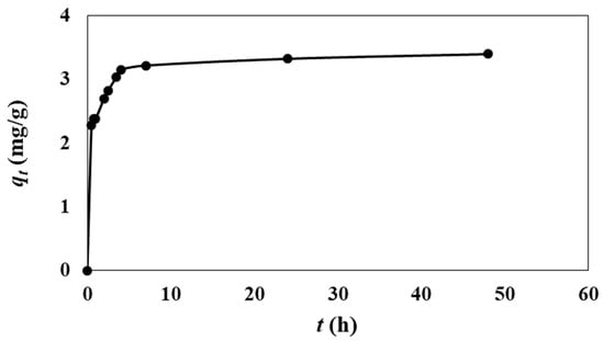 The effect of the contact time on the removal of RR120 by PN6 microplastics is illustrated in Figure 3. The uptake was found to rise with time, and equilibrium was reached after 7 h. Ay and Sarpaşar [] found that the removal equilibrium of RR130 when using zeolite and Fe3O4@zeolite composites was attained between 30 and 50 min.