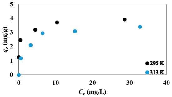 Isotherms of the adsorption of RR120 onto PN6 microplastics at 295 K and 313 K. Experimental setup: t = 24 h, pH = 2, A.R. = 125 rpm, solid/liquid ratio 0.4 g/0.05 L, Ci range: 10–60 mg/L (n = 2).