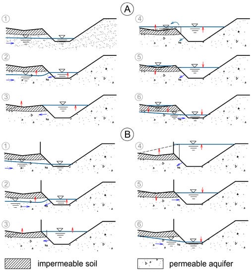 In the case of the construction of flood control works, their subsurface parts may also affect the natural groundwater regime during non-flood periods, during which groundwater moves from higher locations towards streams which drain adjacent aquifers [11]. Here, maintaining free communication between the river and aquifer is essential for, inter alia, maintaining base flow in streams [12,13,14]. Therefore, seepage barriers such as cut-off walls and grout curtains should be designed to be partially penetrable.