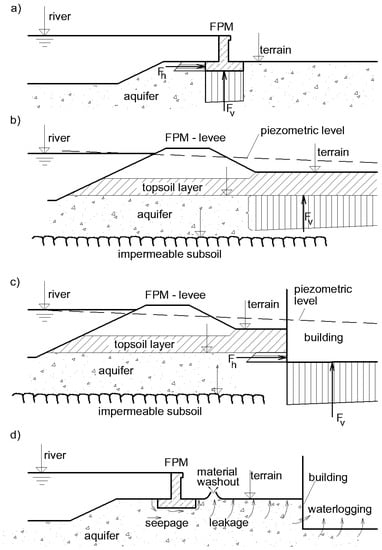 - In case of long-term floods, in combination with the permeable aquifer, waterlogging of the area behind the FPM may occur due to seepage onto the terrain (Figure 2d).