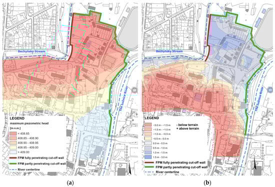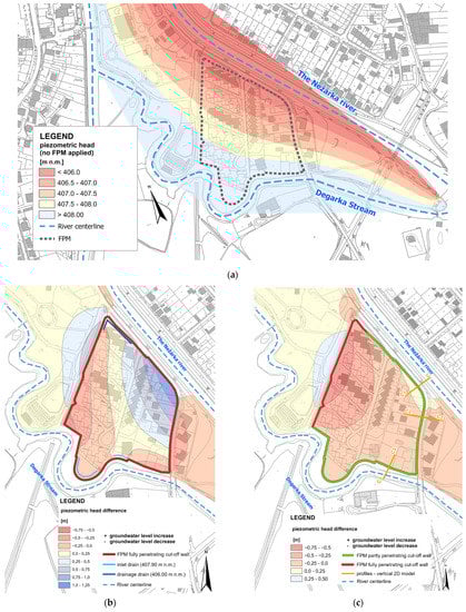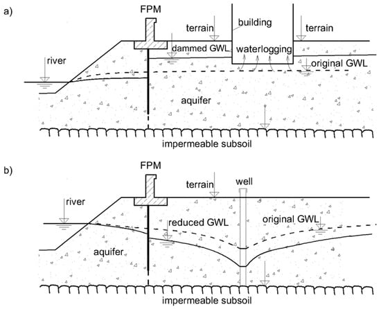 - Subsurface elements of the FPM may unacceptably increase the water level in the aquifer behind the FPM (Figure 3a), increase the water pressure on the floors and walls of cellars, and cause dampness of walls and even waterlogging of the terrain. The situation may be crucial in case of the infiltration of rainwater in urban areas behind the FPM.