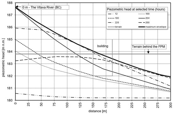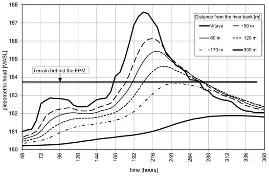 An example concerning the time evolution of the piezometric head in an aquifer adjacent to the Vltava River in Prague during a flood in 2002 can be seen in Figure 4 and Figure 5. It can be seen that the peak piezometric head follows the peak of the water level in the Vltava River (boundary condition), with a certain degree of attenuation and time shift. The rate of propagation depends on the hydraulic conductivity of the aquifer and on the storativity. As a rule, in the case of an unconfined aquifer, the seepage propagation is considerably slower than in the case of a confined one as the unsaturated soil should firstly be saturated before the phreatic surface can rise further in the aquifer.