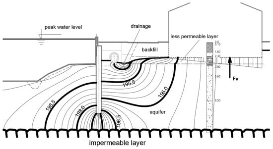 - Flood protection structures are subjected to forces acting on their subsurface parts. In addition to earth pressure, forces caused by the groundwater underflowing the foundations must be taken into account. The most critical horizontal (Fh) and vertical (Fv) water pressure forces are shown in Figure 2a.