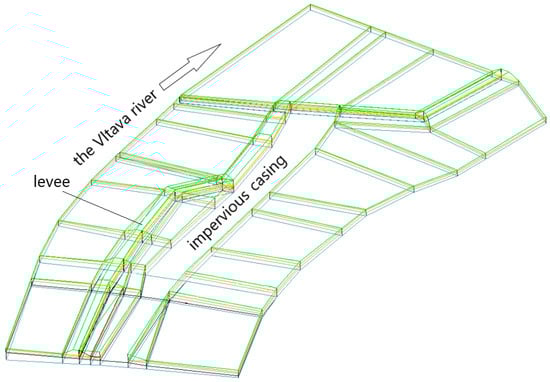 As mentioned above, 3D models are used in cases where dimensional simplifications are not feasible. There is a large variety of practical situations where the flow direction is quite general and simpler models (1D, 2Dh, 2Dv) are not applicable. Such flow may occur in complex geological conditions combined with spatially variable civil structures interfering with the flow domain [53,54,55]. Due to the large number of computational nodes in a 3D model, the flow domain size is usually minimized while boundary conditions are determined by a preliminary simplified analysis using 2D models. During modelling, it is feasible to divide the flow domain into homogeneous blocks (macroelements; see Figure 11), and to apply the computational mesh (e.g., finite elements) later on.