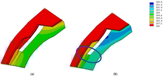 Comparison of piezometric heads on the base of a surface layer: (a)—only impervious topsoil, (b)—anthropogenic layer on the surface. Blue ellipse indicates detail of a levee with the descending tunnel ramp shown in Figure 13.