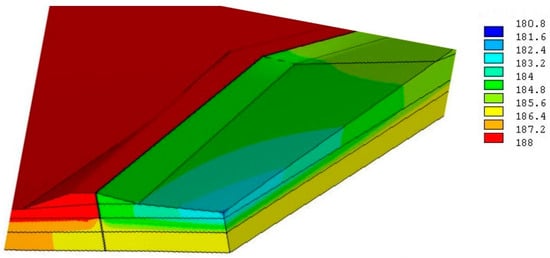 The following example concerns the complex seepage flow below the levee, which interferes with subsurface elements of the tunnel crossing the Vltava river (Prague) and gradually rises out to the terrain in the protected area behind the levee. In Figure 11, a layered scheme of macroelements is depicted. These macroelements correspond to geological and construction layers and are further meshed by finite elements with a size of 0.5 m, which ensures the accuracy of the results is sufficient. Figure 12 shows a comparison of piezometric heads for various geological conditions, i.e., an aquifer overlaid by relatively impervious topsoil (a) and surface layers consisting of anthropogenic backfill (b). In Figure 13, a detail of a levee with a descending tunnel is depicted for scenario (b).