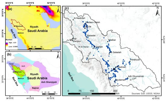 Location map of the Wadi Al Hamdh watershed. (a) A watershed of the study area in red overlain the Rainfall map; (b) A red polygon of the study area overlain the Saudi Administrative map; (c) Points showing farms, and wells.