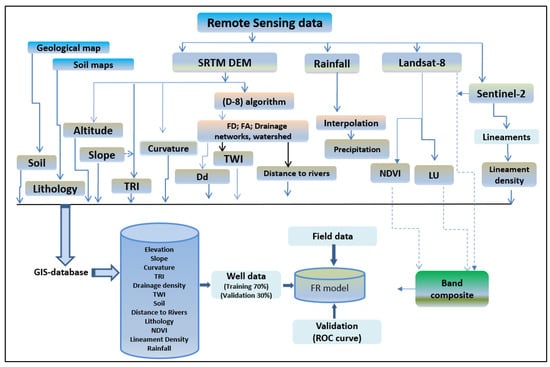 Mapping groundwater resources, using remote sensing (RS) and geographic information systems (GIS), has become an increasingly popular technique [15,16]. Numerous elements, including geology, topography, climatic conditions, soil, land use, land cover, slopes, distances from rivers, and precipitation levels, have an impact on groundwater dispersion [7,17]. During the past few years, numerous scientists have employed a variety of cutting-edge analysis techniques and simulation approaches to pinpoint places with groundwater potential [7,18,19,20].