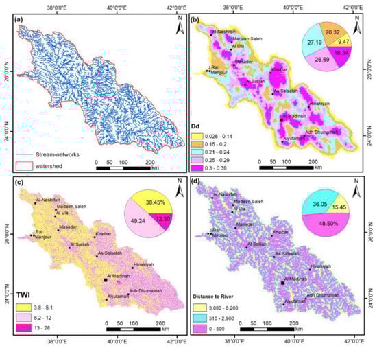 Hydrologic factors; (a) drainage-networks; (b) Dd; (c) TWI; (d) distance to river.