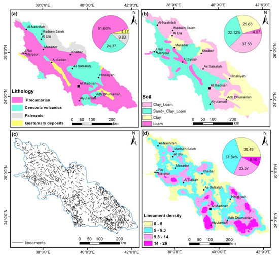 Geologic factors; (a) lithology; (b) soil; (c) lineaments; (d) lineament density map.
