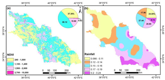 Ecologic and climatic factors; (a) NDVI distribution; (b) rainfall intensity.