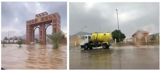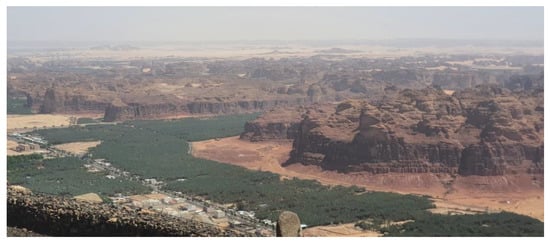 The Wadi Al-Aqiq valley connects all valleys at Al-Ayoun in Al-Madinah Al-Munawarah, providing a 150 km recharging region south of Al-Madinah. It discharges its water in a trellised drainage pattern. The Wadi Qanah-Al-Hamdh watershed connects all the valleys in the Al-Madinah and flows from the southeast to the northwest. It is >400 km long and around 150 km wide [83]. The three mentioned sub-basins flow in the Tayef region; the Wadi Qanah-Al-Aqul valley is 300 kilometres southeast of Al-Madinah. These valleys’ watersheds display a trellised structure of drainage, which may be related to the Red Sea Rift. Additionally, groundwater wells that draw water from an aquifer of clastic Paleozoic rock are used to irrigate vegetation in Al Ula Town (Figure 12).