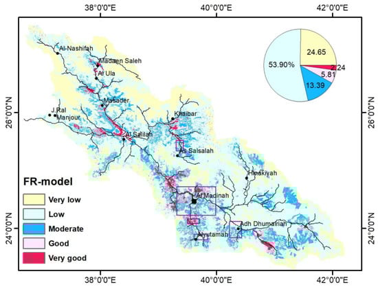 Using the FR model, we determine here the spatial relations between features and controlling factors (Table 1). Areas of low elevation and slope are more likely to hold groundwater than higher elevation [14,16,79]. This correlated with areas of low slope that are positively related to high groundwater potential. In terms of the hydrologic properties, the Dd reveals areas of high FR values and groundwater potentiality. The groundwater potential was promising for the highest TWI classes as TWI positively correlated with FR values [26]. The areas close to the streams from 0 to 500 had the highest FRs (1.7) which reveals that the nearness to the streams results in more recharging capability. However, areas farther from the rivers had low potentiality. In terms of geologic properties, the Precambrian rocks display a high FR value and groundwater potential, as such areas are dominated by basement rocks that hold groundwater in a fractured aquifer. This coincides with the FR values that are higher with the lineament density as the Precambrian and Cenozoic volcanic rocks must have fractures to hold groundwater. The groundwater potential probability has a strong positive correlation with NDVI values, as the highest FR values coincide with the occurrence of vegetation and hence groundwater in arid regions [26] and rainfall intensity. Although the area is characterized by rugged terrain with limited rainfall, combining the evidential layers revealed that good and very good zones cover ~8% of the study region.