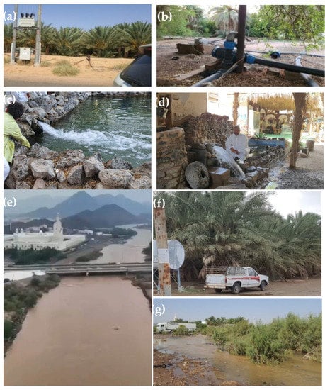 Field observations (a) Madaen Saleh; (b) Al Ula area displays the pumping well and vegetated area; (c–e) water wells at Al Madinah; (f) Al Yutamah area that is enriched in date palm trees; (g) Wadi Aqiq surface water flow during rainy storms.