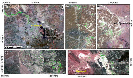 Landsat-9 of the study area (a) vegetated areas around Al Madinah and Quaternary volcanics in black; (b) Al Yutamah farms south of Al Madinah; (c) Adh Dhumainah farms south of Al Madinah; (d) band combination 12, 8, 3 of Sentinel-2 of the area south of Al Madinah; (e) Sentinel-2 of Alyutamah area reveal the signature of surface water in a bright tone. Polygon in magenta color in Figure 8 is the reference location for these sub-figures.