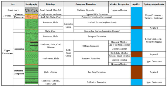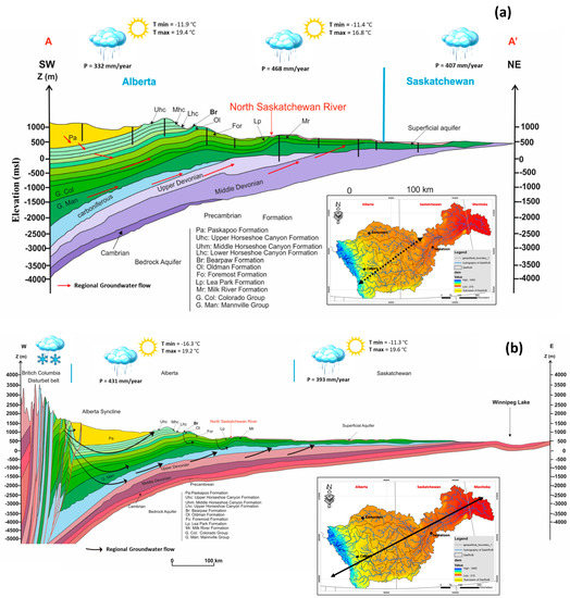 To develop this fine-grained geological study of the SRB, we had to schematize geological cross-sections that have already been made for the provinces of Alberta [54,60,61,62,63,64,65,66], Saskatchewan [67,68], and Manitoba [22].