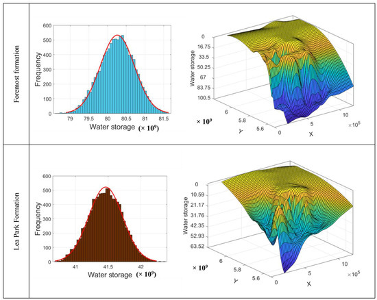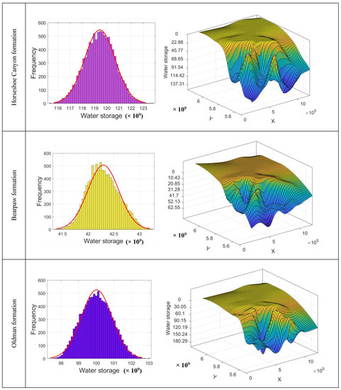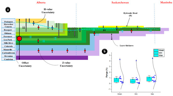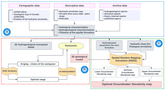 Several models can be proposed from the kriging method using several types of variograms. N 3D geological models may be tangible, despite the significant variation in formation thicknesses between one model and another. As shown in Figure 6, the propagation of the uncertainty and the error on the thicknesses of the formations gives rise to a global offset uncertainty that will be considered later in the estimation of the GWS (Figure 6a). The same process is applicable also for the hydraulic head data for the Paskapoo Formation (Figure 6a) and for the hydrodynamic data (Figure 6b). To quantify these uncertainties, the 3D geological model was run 150 times. This gave us 150 3D geological models based on 150 variograms (150 sills and 150 ranges). The 3D geological modeling induced a systematic error range. After the interpolation, we could quantify the error range, which was between −4.67% and 5.41% in terms of the thickness of geological formations; that is, ±5% of the thickness of the formations in each hydraulic or oil drilling taken into consideration. The overall workflow of SRBS application is shown in Figure 7.