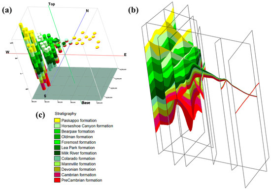 The following variographic models were selected: (i) the Gaussian model without a nugget effect for the Paskapoo, Horseshoe Canyon, Bearpaw, and Oldman Formations; (ii) the exponential model without a pipit effect for the Foremost, Lea Park, Milk River, Colorado, Mannville, Cambrian, and Precambrian Formations; and (iii) the exponential model with a nugget effect for the Devonian Formation. Indeed, this last model is not recommended for 3D geo-modeling because it is based on simulation algorithms that only lead to a random distribution and do not represent the geological complexity of the studied structure. However, in our case, only this model showed the best correlation and anisotropy; therefore, it was chosen for the Devonian Formation.