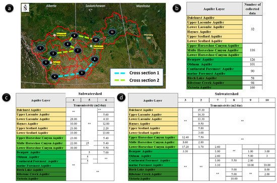 For the hydrodynamic parameters of each aquifer, several data points were collected and harmonized (Table 1) to yield a more homogeneous and representative database. A total of 781 transmissivity values were processed and classified by the aquifer. These average values are shown in Figure 5, particularly for cross-section 1 (Figure 5c) and cross-section 2 (Figure 5d).