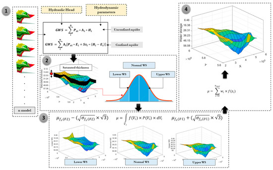 The next step was the computation of groundwater storage using Equations (3) and (4). This was performed using a dynamic algorithm in MATLAB. The Gaussian quadrature was used for each pixel to convert the bagged values into weighted summations that are a function of the error interval determined by the SRBS. Based on the distribution explained in Figure 7, a lower water storage (WS), upper WS, and normal WS were defined and selected to estimate the final groundwater storage map using the abscissas and weights for the standard normal distribution, presented in Table 2.