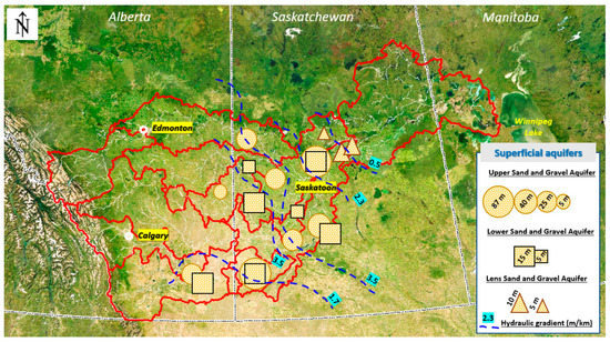 Additionally, in Italy, Ref. [34] constructed a geological model for an archaeological site to establish a conceptual model for the area of the colosseum (Rome, Italy). Geostatistical techniques were used in their study to properly select the type of interpolation. The resulting conceptual model was used to identify the main gaps in existing knowledge about the groundwater system and optimize the planning of a piezometric monitoring network. In addition, Ref. [35] used data from 300 hydraulic boreholes to set up a 3D geological model in the subalpine basin in Italy. The resulting model represents the complexity of the fluvioglacial stratigraphy and hydrogeological units in the study area and demonstrates the retarding effect that glacial terraces can have on flood wave propagation in aquifers. It allows the assessment of total groundwater volume and areas of low conductivity. These findings are common to many areas around the world, and here, we can cite the example of the Saskatchewan River Basin (SRB) in central Canada, which is subject to the dual actions of climate change and anthropogenic activities.