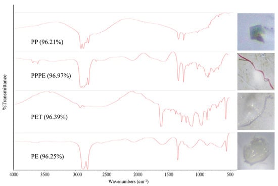 Typical µ-FTIR spectra of microplastics detected in multiple-used zones in Eastern Guangdong, the South China Sea; PP: poly(propylene); PPPE: polypropylene-polyethylene copolymer; PET: polyethylene terephthalate; PE: polyethylene; percentage in the bracket: matching degree with the standard.
