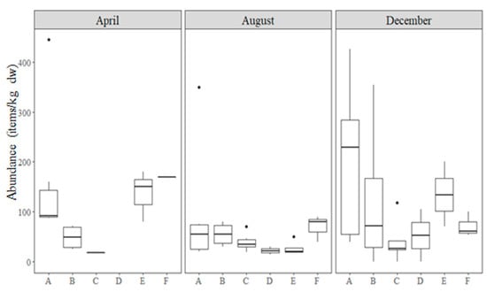 Seasonal currents can influence the microplastic abundance in the sediment. A relatively higher abundance of microplastics was found in winter than in summer (Figure 3). The increase in microplastic abundance in coastal sediments in December was possibly due to dilution from rivers [51]. As A1–A5 and A7 are in the dilution water area in winter with salinities <30‰, the decrease in salinity resulted in a reduction in floating microplastics, therefore, an increase in their sedimentation. Furthermore, the river input also brought large quantities of microplastics into the coastal area. Additionally, the raft culture along the coastlines resulted in biofilms generated on the microplastic surface and promoted their deposition with increased density; similar phenomena were also reported elsewhere [52]. Although the tendency of microplastic accumulation in the sediment was found during the dry season (spring, April), resuspension might be induced during the wet season (summer, August), leading to the decrease of microplastics in sediment. This phenomenon was also observed in the Liangfeng River where microplastics tended to settle in the dry season and resuspend in the wet season [15]. Upwellings in summer also affected the floatation of microplastics, which were observed at Sites B2–B4 and F2–F3 in August [53,54]. These sites are located in the margins where the depth changes, and the upwellings in the marginal waters of the Eastern Guangdong continental shelf in summer are related to the shelf break [55]. As a result, the microplastic abundance of B2–B4 and F2–F3 in August was low. However, no statistical significance was found between microplastic abundance at sites within the summer upwellings affected area and in other areas (p > 0.05). Likewise, the statistical insignificance of microplastic abundance between upwelling and non-upwelled sites was also noticed in seawater from the Benguela upwelling sites in the Atlantic Ocean [56]. Nevertheless, microplastic concentrations were observed to be higher near the water surface during upwelling than during downwelling conditions in Ría de Vigo, Spain [13]. In addition, the lower fluctuation of microplastic distribution in August compared to those in April and in December was due to weaker hydrodynamic conditions including tides, waves, and currents, similar to observations from the Bay of Brest, France [57].