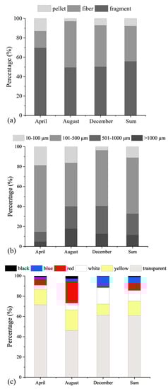 As displayed in Figure 4a, the shapes of the detected microplastics were mainly fragments (55.8% in total, 69.8% in April, 49.5% in August, and 50.3% in December), followed by fiber (36.4% in total, 17.2% in April, 47.6% in August, and 42.7% in December), and pellets (7.8% in total, 13.0% in April, 2.8% in August, and 7.0% in December). Fragments were detected to comprise 90% of the microplastics, much more than fibers, in sediment at Tirpitzmole in Kiel Fjord, Germany [61], while they were 34–43% in the Bay of Bengal, India [33]. However, fiber was found to be the most prevalent in many other sediments, e.g., Changjiang Estuary, China (93%, [8], intertidal and subtidal sediments on the coastline of Ireland (86%, Marques Mendes et al., 2021), Jakarta Bay, Indonesia (55.7%, [5]. The low specific surface area and high density of fragments and fibers improved their sedimentation [62]. It was found that fragments were attributed to the degradation of macro- and mesoplastics (>5 mm) (Free et al., 2014), while fibers were possibly from fishing and sewage (including synthetic fibers from laundering) [12,48].