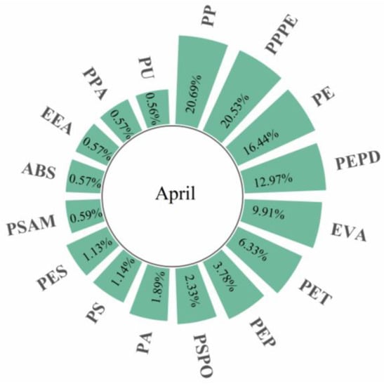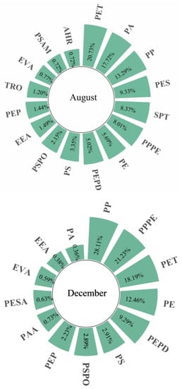 Overall, 21 kinds of polymers were detected, among which, 16 were detected in April, 16 were detected in August, and 13 were detected in December (Table 1, Figure 5 and Figure S4). On the whole, polypropylene (PP), polypropylene-polyethylene copolymer (PPPE), polyethylene terephthalate (PET), and polyethylene (PE) comprised 22.41%, 17.89%, 15.28%, and 12.96% of the detected microplastics, respectively (Figure 5). These compositions are commonly used in the textile, packaging, automobile, electronic, and electrical industries. For instance, PP and PE are frequently applied in food packaging, cosmetics containers, and furniture. Polyethylene terephthalate is generally used in drink bottles, cosmetics containers, and textiles. The increased proportion of PET in August was ascribed to the improved consumption of bottled drinks in warm summer. The polypropylene-polyethylene copolymer is frequently utilized in the automobile, electronic and electrical industries, and the building industry. The identification of compositions was in line with the observation of colors, as most transparent microplastics were found to be components widespread in packaging materials. Urbanization and industrialization have been reported to extensively influence microplastic contamination [64]. The growth of the population during urbanization increases the use of plastics in daily life; accordingly, the production of plastic products by industries increases so as to satisfy the raising needs of the growing population. The improved production and use of plastics along with the improper management of plastic waste consequently enhances the amount of plastics entering the environment. Furthermore, abrasive wear during the production and use of plastics is unavoidable, which is presented as microplastics in the environment. Hence, anthropogenic activities have intensive relations with water environments, which are at a high risk of microplastic pollution [65]. The sampling area is largely affected by human activities, as it is nearshore and close to the downtown area of Shantou city and Nan’ao Island, with high urbanization and tourism. Various manufactories in industrial areas of Shantou, producing plastic packaging/toys, furniture, etc., are not far from the river net. Moreover, some factories scattered along rivers may contribute to microplastics in the sea, e.g., the electroplating factory along the downstream region of the Rongjiang River. In addition, laundering in the downtown area and tourism in the city may be sources of microplastics entering the marine environment.