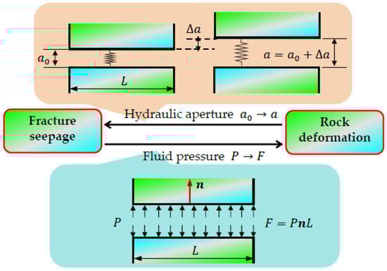 The stability of rock slopes is currently a hot topic in rock engineering and rock mechanics [1,2]. Normally, there are multiple discontinuities within a rock mass, such as joints and fractures, which often reduce the strength of the rock mass and cause failure of the rock slope. In addition, these discontinuities can serve as groundwater flow channels, forming fracture seepage networks [3]. Seepage pressure and the hydraulic head of the groundwater act on both surfaces of the fracture, which induces both hydrostatic pressure and seepage forces, leading to rock deformation, changes in fracture aperture and permeability, and even evolution of the fracture network (e.g., reducing the friction coefficient and strength of the fracture) [4]. On the other hand, changes in the state of fractures back influence the fluid flow, as shown in Figure 1: when the hydraulic pressure on the fracture interface is greater than the normal contact compression, the fractures will open or expand. Thus, it is critical to consider a hydro-mechanical coupling model using numerical simulations when seepage-deformation problems of rock fracture interaction are encountered. In addition, engineering practices show that the rise of groundwater levels and seepage in fractures are important causes of rock slope instability [5,6,7]. Therefore, it is essential to develop a coupled seepage–deformation model to study the influence of fracture seepage on rock slope stability.