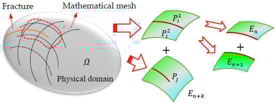 The dual cover system in the NMM is constructed by means of MCs and PCs. The MC consists of a collection of mathematical patches. Each mathematical patch is a simply connected domain. By dissecting one or several mathematical patches with the components of the problem domain—namely, the boundary, the material interface, the joint/fracture, and the crack—the physical patches are obtained. All these physical patches comprise the PCs. The overlapping region of several PCs forms a manifold element (ME). Figure 2 gives a brief illustration of a cover system employed in the NMM, and a sketch the construction procedure of the cover system. When a hypothetical physical domain, , is used for modeling, the mathematical mesh covers the whole domain , and the physical boundary and discontinuities (i.e., rock fractures/fissures, joints and cracks, etc.) divide the domain into many different PCs. As highlighted, inside the red dotted circle, three PCs, denoted by , and (subscripts i and j are the MC indices, respectively), are formed from the fracture intersecting with the MCs. Then, the NMM elements are built by these overlapping PCs: and are formed from and , and (subscripts n and k are the re-index of the updated MEs) is formed by .