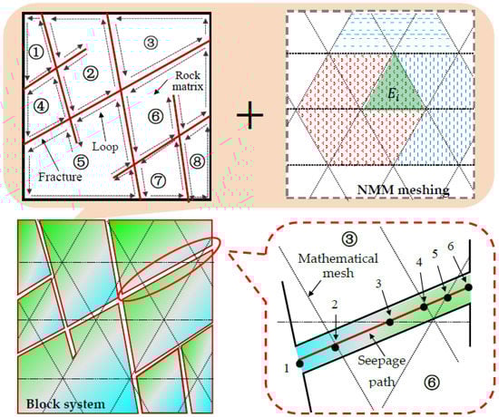 Figure 3 shows a 2D example of a fracture network, in which the problem domain, dissected by six intersecting fractures, consists of eight independent blocks (i.e., denoted by numbers from to ⑧). Each block is constructed by several line segments and surrounded by a closed loop to model the contact and fluid flow in the NMM simulations. Resorting to the NMM mathematical meshing and physical meshes, each block is divided into a series of MEs (e.g., Ei in Figure 3); then, the block system, consisting of a fracture network and seepage paths, is established. In this way, the coupling between the fracture flow and deformation block is built. For example, the aperture between two connected blocks, denoted by ③ and ⑥, is filled with flowing fluid. The seepage path of 1–6 is divided into five small line segments by mathematical meshing, i.e., 1–2, 2–3, 3–4, 4–5, and 5–6, and each divided seepage path has two surfaces, which constitutes a fracture seepage element. Each coupled surface and separated seepage path is exactly a line segment of a loop belonging to blocks ③ and ⑥, respectively. Therefore, the closed loops are not only used to compute the contact forces but are also employed to generate the potential fracture network for calculating fluid flow. The simulations of seepage pressure in this study are based on the fracture coupling model, and the triangle meshing technique is employed to form MEs (e.g., in Figure 3) in the computations.
