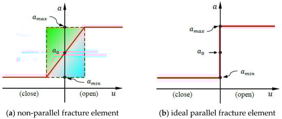 where and are the initial aperture and normal increment, respectively. As discussed in [43], the minimum and maximum values of the fracture aperture are prescribed as and , respectively. The expression of increment can be written for both non-parallel fracture and ideal parallel fracture elements (as can be seen in Figure 4) as follows: