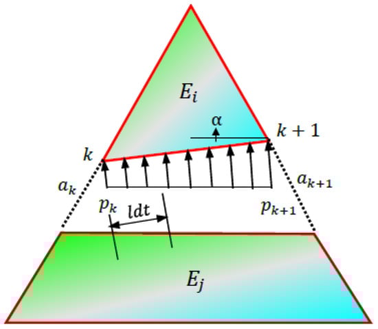 Fluid flow in fractures imposes fluid pressure on the interface of the fractures, producing deformation of rock fractures and changing the fracture aperture and the hydraulic conductivity of the fracture element. Subsequently, the hydraulic heads will be redistributed in the flow network. In the present study, fluid pressure on the fracture element can be assumed as a linear distributed behavior. As shown in Figure 6, the fluid pressure is acting on the boundary of by the manifold element . If and are the fluid pressures acting on element , the coordinates of points and are and , respectively. The fluid pressure at any point on the element boundary can be expressed as: