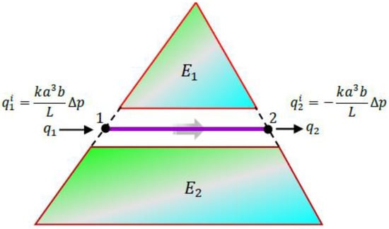 where is the fracture hydraulic conductivity, is the area of the fracture cross-section, is the piezometric head loss, and is the length of the fracture segment i. Then, the discharge at two end nodes of fluid element i can be obtained based on Equation (26), which is expressed as: