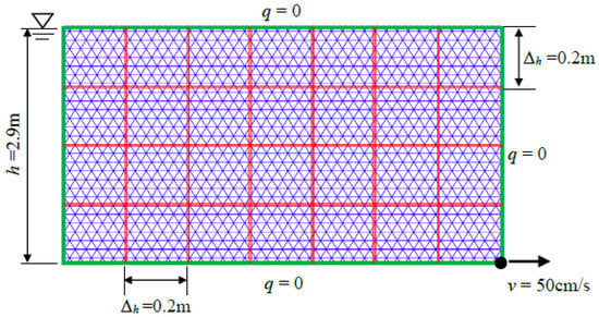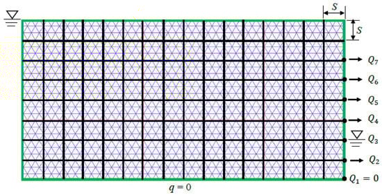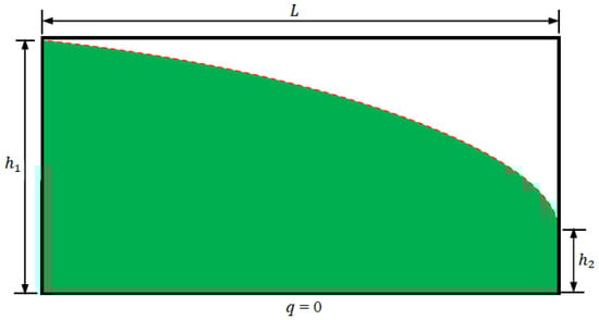 Firstly, to verify the proposed coupled model for the NMM, a 2D flow in a homogeneous aquifer is studied. As can be seen from Figure 8, the length of the model is L and the prescribed water heads are h1 and h2. The bottom boundary of the model is assumed to be impermeable (i.e., q = 0). The analytical solution of the total discharge for this model is [47]: