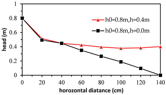 - h0 = 0.8 m is prescribed at the left side of the model, but the right side has a water head of h = 0.4 m.