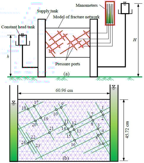 To further validate the coupled seepage–deformation algorithm, a steady-state flow problem in a complex fracture network is simulated, and comparison with the experimental results as referred to in [49] is then carried out to check the proposed method. As shown in Figure 13, a schematic of the complete laboratory device is illustrated, and a physical experimental model to simulate 2D flow through jointed fractures is then constructed. The depth and width of the model are assumed to be 45.72 cm and 60.96 cm, respectively.