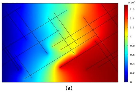 The pressure and flow rate distributions of the fractures are calculated by the NMM. As shown in Figure 14, the calculated hydraulic pressure with rock matrix permeability (e.g., 1.0 × 10−14 m2) by FEM code indicates the pressure distribution when porous media is considered (Figure 14a), but the simulated results using the proposed model (Figure 15b) by the NMM agree very well with both the hydraulic pressures and the flow rates at the measured ports. It is clear that the proposed seepage–deformation model is more efficient and flexible for simulating steady-state fluid flow in discrete fracture networks.